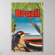 Impresión de viaje con tarjeta postal de playa brasileña. Afiche de un viaje brasil con un pájaro pescador en una playa.
