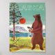 Poster de Viajes Alaska Vintage con Oso y Pescado. Afiche retro vintage colorido.