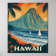 Envíate a las doradas costas de Hawái con este afiche de viaje inspirado en la época. Las palmeras se desprenden, las olas turquesas se oyen y las puestas de sol pintan el cielo en tonos naranja y rosa. Ya sea que haya estado en Hawái o anhele explorar su paraíso, esta postal captura la esencia de aloha.