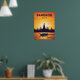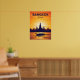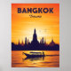 Poster de viajes vintage estilizado que representa el icónico templo Wat Arun en Bangkok, Tailandia, al atardecer con un bote en el río.