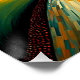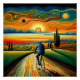 A.I. creó la impresión de una persona que monta una bicicleta a lo largo de un sinuoso camino dentro de un paisaje surrealista de campos y árboles al atardecer.