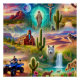 Esta escena hipnotizante te invita a un mundo de descubrimiento espiritual, donde los desiertos vibrantes se encuentran con vastos campos de flores silvestres bajo una brillante puesta de sol. Alquilar cactus y extensas dunas de arena crea una sensación de libertad indomable, mientras que cuevas ocultas y lagos cristalinos tienen sabiduría secreta. Una figura sagrada mira desde el cielo, encarnando el espíritu atemporal de la tierra. Los árboles atrapados en la energía giratoria conectan los reinos físicos y místicos, mientras que lobos, coyotes y otras criaturas del desierto deambulan, mezclándose sin problemas en la belleza del otro mundo. Todo el paisaje pasa con la vida y la energía espiritual, ofreciendo un viaje a un entendimiento más profundo y a una conexión con el universo. Por favor, revisa nuestros otros diseños y sigue!