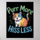 Este encantador gráfico muestra un alegre gato personalizado con piel impactante bloqueada a color en parches azules, naranjas y blancos, con una corbata de arco morado. El gato tiene ojos verdes amplios y expresivos y una sonrisa alegre y de boca abierta. El texto, "Purr More Hiss Menos", se presenta en dos colores diferentes: "Purr More" en verde y "Hiss less" en azul claro, abogando por un temperamento felino positivo. El diseño está puesto sobre un fondo negro sólido. Descarga digital sólo para uso personal.