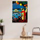 Este poster de viaje vintage se hace en rojo intenso, azul, negro y amarillo profundo. Se trata de un espectáculo sobre el agua que asisten hombres y mujeres vestidos de forma formal en la orilla.