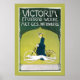 Diseño Art Nouveau de una mujer en bicicleta, su borzoi a su lado. Predominan los colores verde oliva, verde oscuro y blanco.
