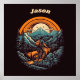 Ciclismo Vida, pintura retro en naranja y azul de un ciclista que recorre las montañas y el bosque con el sol en el fondo