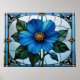 Hermosa pieza de vidrio teñido diseñada con una gran flor azul con detalles intrincados y colores vibrantes. La flor está rodeada de hojas verdes y un borde decorativo que muestra una mezcla de texturas de vidrio azul y transparente.