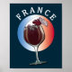 Ilustracion de un vaso con una ola de vino tinto y bandera francesa con texto: Francia. Francia es un país con una gran producción de vino. Poster para mostrar su amor por el vino francés!