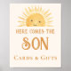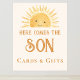 Este Rótulo Baby Shower de Tarjetas y Regalos cuenta con un sol de color amarillo sonriente y una tipografía de terracota. Acuarela original © Michele Davies.