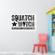 ¡Estar en el reloj de la SQUATCH! ¡Creo que hay una escotilla en este bosque! Texto de bloque de estilo grueso y angustiado con dos criaturas de escotilla de pie en las letras. ¡Únete al reloj de pulsera del equipo!