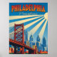 Celebre el encanto de Filadelfia con esta postal de estilo retro que presenta el icónico puente Benjamin Franklin, el audaz perfil de la ciudad y el vibrante diseño de la explosión del sol - un recuerdo perfecto para coleccionistas, viajeros y amantes del arte urbano vintage.
