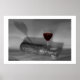 La imagen de un vaso de vino dulce y de una botella de vino antiguo está adornada con largas y dramáticas sombras.