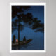 Esta es una imagen realzada digitalmente de un antiguo bloque de madera oriental japonés Ukiyo-e de 1900 de dos personas en un bote flotando a través de un pueblo japonés bajo un cielo estrellado.