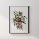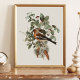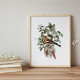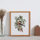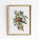 A vintage-inspired botanical illustration featuring a delicate bird among leaves and wild mushrooms. Soft natural tones and fine details create a calm, timeless nature print.