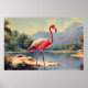Un hermoso flamenco rosa parado sobre un río en una selva tropical y fondo de montaña.