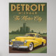 A retro poster featuring a yellow classic car, celebrating Detroit, Michigan as the Motor City with vintage typography.