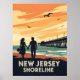Disfrute del encanto de la costa de Nueva Jersey con esta postal de estilo vintage que cuenta con una pareja romántica que camina a mano al atardecer, un pintoresco muelle y tranquilas olas del océano, perfecta para coleccionistas y amantes de la decoración costera.
