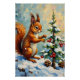 A whimsical vintage Christmas scene featuring a red squirrel decorating a tiny pine tree with winter berries. A sweet and nostalgic woodland moment perfect for holiday products.