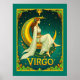 Poster en una mujer con túnicas blancas que fluyen, con una flor en el pelo, sentada con gracia en una luna de oro, rodeada de estrellas. El marco Art Nouveau ornamentado con flores y la palabra "VIRGO" completan el ilustracion celestial de zodiaco.