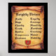 La pintura de Linda Baysinger Peck de un pergamino, con texto de las virtudes de los cuchillos, que incluye Fe, Esperanza, Caridad, Verdad, Justicia, Temperatura, Prudencia, Lealtad, Coraje, Humildad, Fortitud, Cortesía, Honor y Nobleza. Genial para los que disfrutan de la caballerosidad y el código de conducta del caballero. Imagen © Linda Baysinger Peck Todos los derechos reservados.