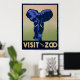 Afiche de época que promociona el zoológico como lugar para visitar, mostrando un elefante.