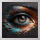 Un retrato de clausura que capta el hermoso ojo de una mujer en un estilo abstracto único. Con un toque de color cobre y turquesa sobre un lienzo de carbón vegetal, los elementos grabado en relieve crean una representación fotorrealista que es a la vez llamativa y artísticamente distintiva.