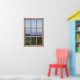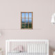 Poster que parece una ventana — una escena de los Alpes Esta es una escena alpina típica de una montaña, mirando a otro edificio encaramado en los Alpes y en los picos de una cordillera distante más allá. Debajo hay prados de montaña y árboles en las pistas verdes. Esta imagen que parece una ventana captura el espíritu de un día de verano alpino en las montañas de Europa.