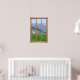 Poster que parece una ventana — valle de montaña Este marco de ventana de madera crea un efecto de ventana falso para tu pared. Crea tu propia vista perfecta de montaña sin mudarse de casa! Por la ventana se ve el verde césped florido de una colina alpina con una pequeña iglesia blanca. Más allá, el valle está muy por debajo y una cordillera a lo lejos. Esta imagen fue tomada en la región Tirol de los Alpes austríacos.