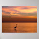 Una hermosa puesta de sol sobre las costas del Golfo de México con tonos rojos, dorados y naranjas hacen una imagen espléndida y colorida. Un gran ave de garza azul se alza en el agua en primer plano, mientras que dos gaviotas de mar se ven en el cielo. La pintura digital está basada en fotografías tomadas en Fort Myers Beach, Florida, por Roger Knowles.