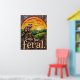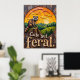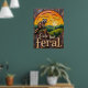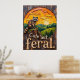 Esta pintura única presenta un mapache con sus distintivos marcadores, encaramado en una formación rocosa mientras el crepúsculo desciende sobre un valle rodante. El cielo es una exhibición dramática de naranjas y amarillos desde el sol que se pone, que arroja largas sombras a través de las verdes colinas. El texto "Cute but feral" está escrito audazmente en amarillo en la base de la obra, representada en un estilo grueso y texturado.