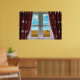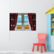 Vista a través de una ventana con cortinas que dan a un campo de heno y balas