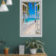 Ventana falsa con vistas al océano. Playa y palmeras, para una pared de oficinas sin ventanas. Divertido, realista poster óptico de ilusión para una oficina o pared de estudio.