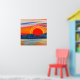 Poster en un océano semiabstracto atardecer detrás de una cordillera, en colores psicodélicos de intenso rojo y naranja, con montañas azul índigo oscuro