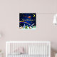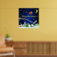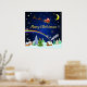 Hermosos paisajes de nieve con árboles de Navidad, casas, un hombre de nieve, y un arcoiris sobre la nieve que cae del cielo. Santa Claus sobrevolando la luna creciente en la noche de los Navidades.