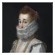 Una mujer adornada con un suntuoso vestido isabelino mira hacia afuera, su gola es exagerada para expresar el efecto que tiene la moda en las niñas. El intrincado vestido sugiere un alto estatus. Su cabello rojo está elegantemente peinado, complementando las ricas telas y los detalles ornamentales de su atuendo.