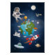 Vrolijke en kleurrijke space explorer poster met een astronaut, raket, spaceshuttle, ufo, enz… die allemaal rond planeet aarde zweven en vliegen. Ideaal als vrolijke noot in elke kamer.