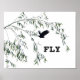 Un pájaro negro vuela desde su rama de sauce. Una imagen simple en silueta cercana. Elija su propio color de fondo.