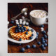 Postre con gofres belgas, arándano fresco y miel en plato blanco, Taza de chocolate caliente con malvavisco