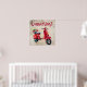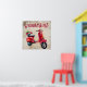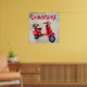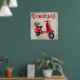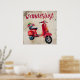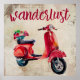 Poster agradable con un cuadro caprichoso de una motocicleta roja con una cesta de flores en la parte de atrás. El ciclomotor tiene un diseño retro a la moda. Listo para la aventura. Wanderlust escrito en un lujoso tipo de letra escrito a mano. Tipografía inspiradora. El fondo es una textura de moda de aspecto angustiado con círculos y marcas aleatorias en un color marrón claro.