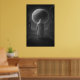 A mysterious cloaked figure stands before a massive moon in a haunting, dreamlike landscape. This dramatic dark-fantasy artwork adds depth, atmosphere, and storytelling to any wall space.