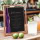 An elegant sign for your wedding bar menu. The words "bar menu" appears in dusty rose handwriting calligraphy with swashes at the beginning and end, with customizable text below. A purple watercolor agate design trimmed with rose gold faux glitter decorates the left border on a slate black background. See our collection for matching wedding invitation suite and day-of stationery.