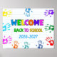 Welcome Back To School First Day Of School Poster. A bright and cheerful design featuring colorful handprints and playful “Welcome Back to School” text with customizable years, perfect for celebrating the excitement of the first day. This vibrant poster adds a fun and welcoming touch to classrooms, helping students feel happy and ready for a new school year.