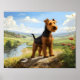 Encima de las amplias vistas de un exuberante valle, un orgulloso Welsh Terrier se alza en un arbusto de piedra en el campo. El rico tapiz de su abrigo, una mezcla de tonos de tierra profunda, contrasta notablemente con los suaves verdes y amarillos de los campos verdes que se extienden a lo lejos. Detrás de él, el paisaje se despliega en un panorama de tranquilidad pastoral, con un río a modo de cinta tallada a través de los prados y una pintoresca casa de campo enclavada en las colinas. Parches de amapolas silvestres añaden una ráfaga de color, reflejando la vibrante fuerza de vida de este intrépido explorador. generativo contenido