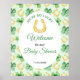 A charming St. Patrick’s Day baby shower welcome sign featuring a soft green background, golden horseshoes, and scattered four‑leaf clovers for a sweet “lucky charm” theme. The central white oval frames the event details beautifully, creating a warm, welcoming design perfect for celebrating a growing family. Ideal for March celebrations, Irish‑inspired themes, or any baby shower that embraces luck, joy, and new beginnings.