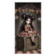This whimsical dark circus doll illustration captures the mysterious charm of a vintage carnival. With her large expressive eyes, flowing red curls, and striped Victorian-style dress, the doll sits quietly atop a travel trunk surrounded by circus tents, bunting flags, and nostalgic stage props.