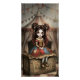 This whimsical dark circus doll illustration captures the mysterious charm of a vintage carnival. With her large expressive eyes, flowing red curls, and striped Victorian-style dress, the doll sits quietly atop a travel trunk surrounded by circus tents, bunting flags, and nostalgic stage props.