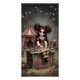 This whimsical dark circus doll illustration captures the mysterious charm of a vintage carnival. With her large expressive eyes, flowing red curls, and striped Victorian-style dress, the doll sits quietly atop a travel trunk surrounded by circus tents, bunting flags, and nostalgic stage props.