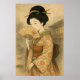 This graceful Japanese-style poster captures a moment of quiet elegance as a traditionally dressed woman gently conceals her expression behind a folding fan. Her ornate kimono and delicate hair ornaments reflect timeless beauty, while the misty background and soft architecture evoke serenity and cultural depth. Ideal for collectors of Japanese art, fashion enthusiasts, and interiors seeking refined tranquility.