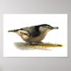 This poster features the White-breasted Nuthatch, an adorable little bird who climbs up and down tree trunks like a miniature woodpecker foraging for insects. He seems very pleased to have just found the perfect seed! He is a stocky bird, with a large head, short tail, powerful bill and strong feet. The upperparts are pale blue-gray, and the face and underparts are white. He has a black cap. The nuthatch is a noisy species with a wide range of vocalizations.