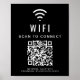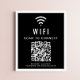 Signo de poster negro moderno y sencillo que permite a sus clientes, clientes o clientes conectarse fácilmente a su red wifi. Sube el código QR de tu wifi y agrega cualquier otro detalle, como el nombre y contraseña de la red en la tipografía blanca moderna. Perfecto para oficinas de negocios, hoteles, propiedades de alquiler vacacional, etc.